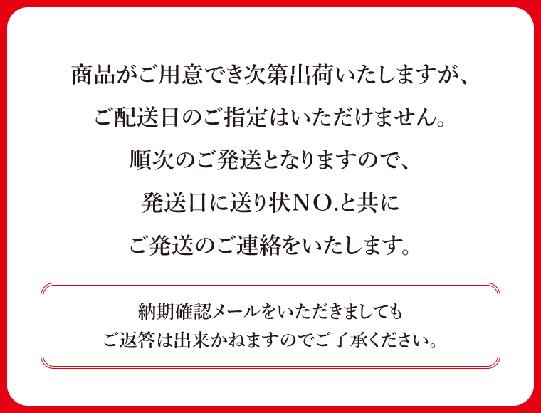 商品の生産、在庫によっては出荷が遅れる場合がございます。